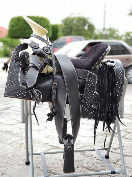 Precio normal $ 9,600.00Precio unitario /AgotadoSilla charra bordada "cara de caballo" negra.