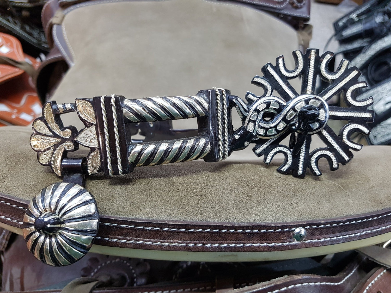 Black with silver Moorish spur, horseshoe slice