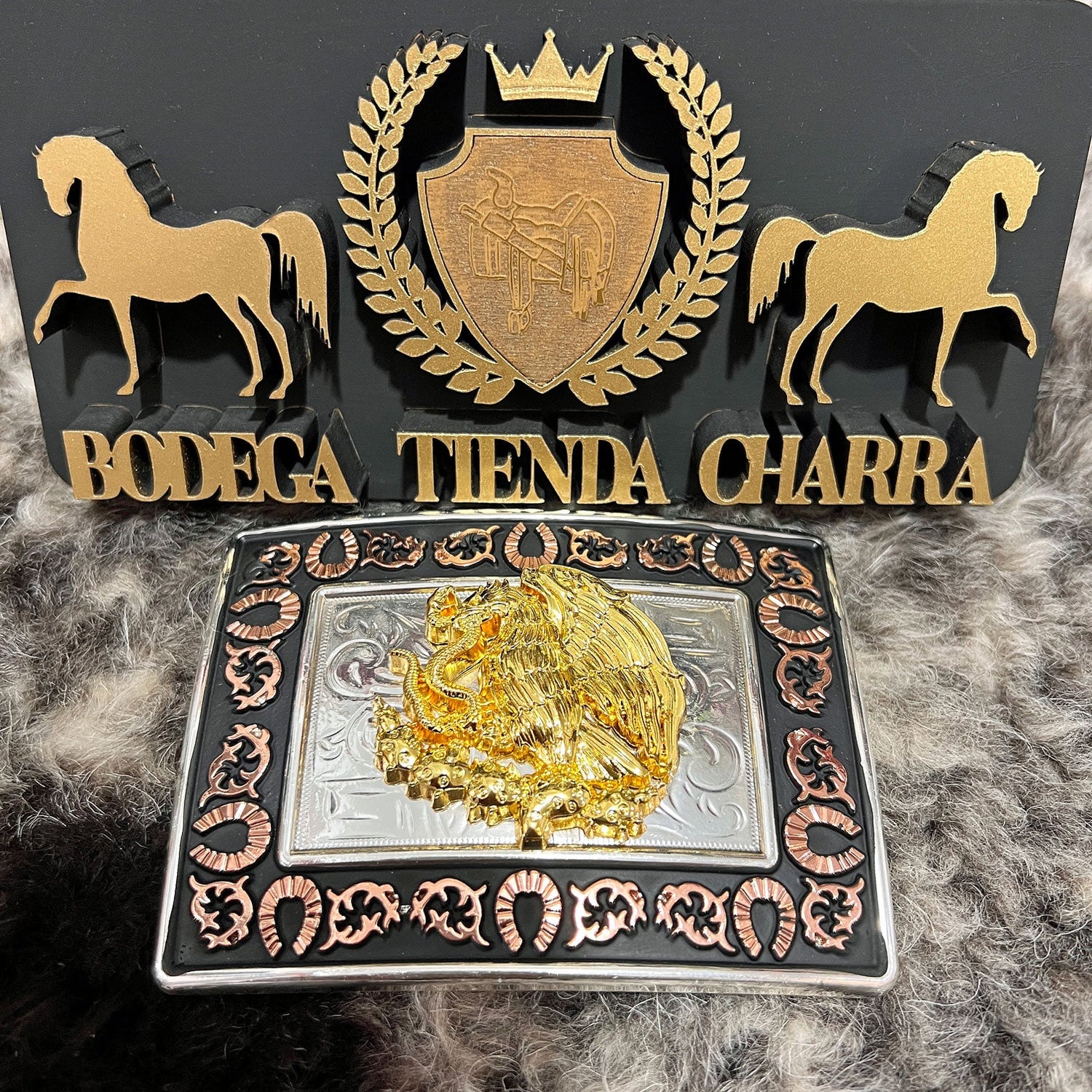 Hebilla charra fina fabribada en alpaca y entintada negro con deslumbrantes trabajos en dorado.