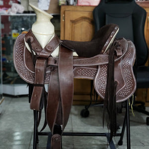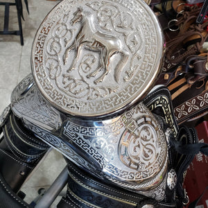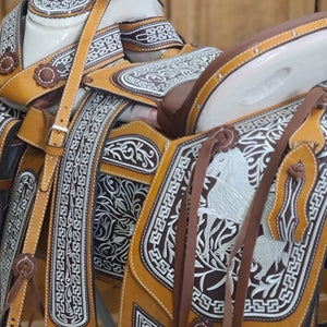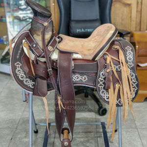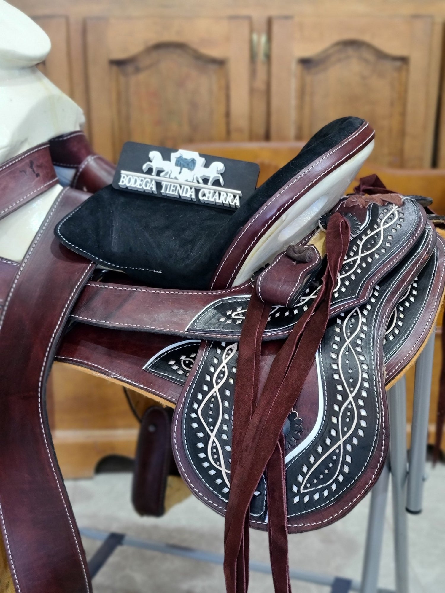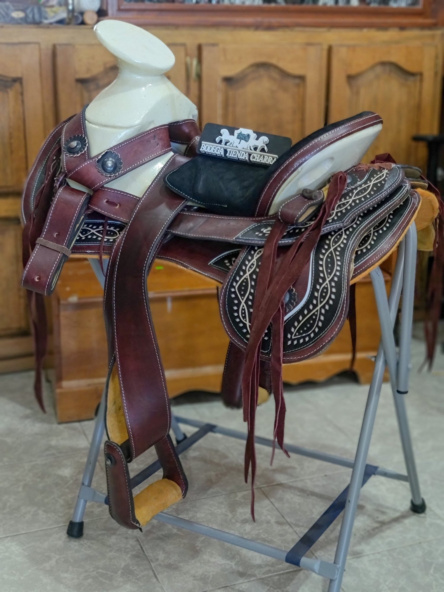 Hecha en vaqueta de primera calidad, forro de carnaza, nada sintético, fuste 15 con equipo completo, cabezada, pecho pretal y correllones para espuelas.