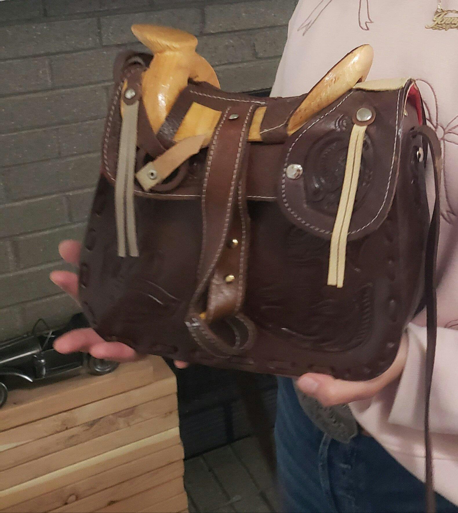 Precioso bolso artesanal modelo silla charra cincelada en piel, fuste de madera