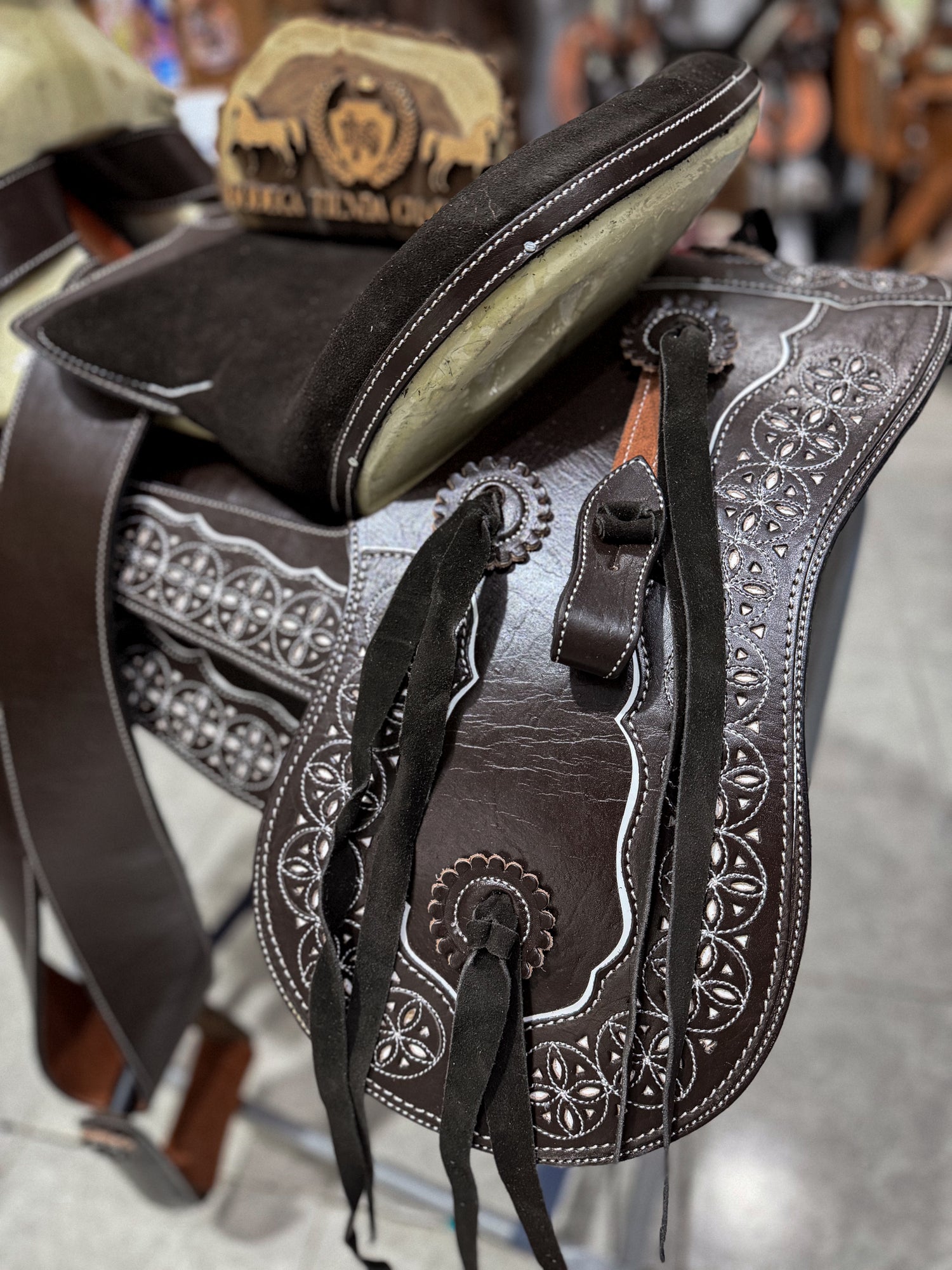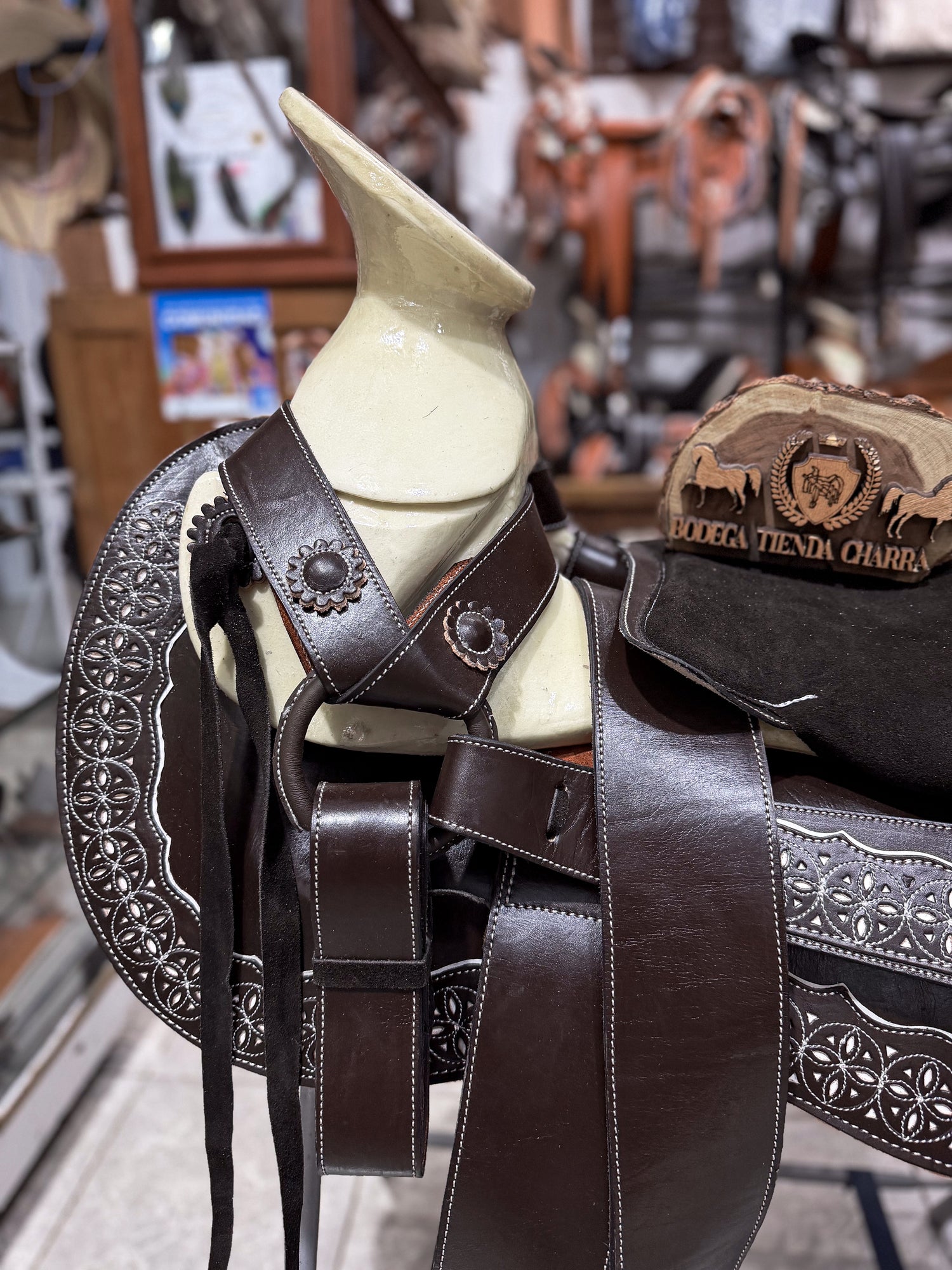 Esta montura charra colita de pato destaca por su elegante color chocolate profundo, combinado con finas vistas resacadas de esfera en color chedrón, que le dan un estilo auténtico, fino y de verdadera talabartería.