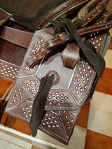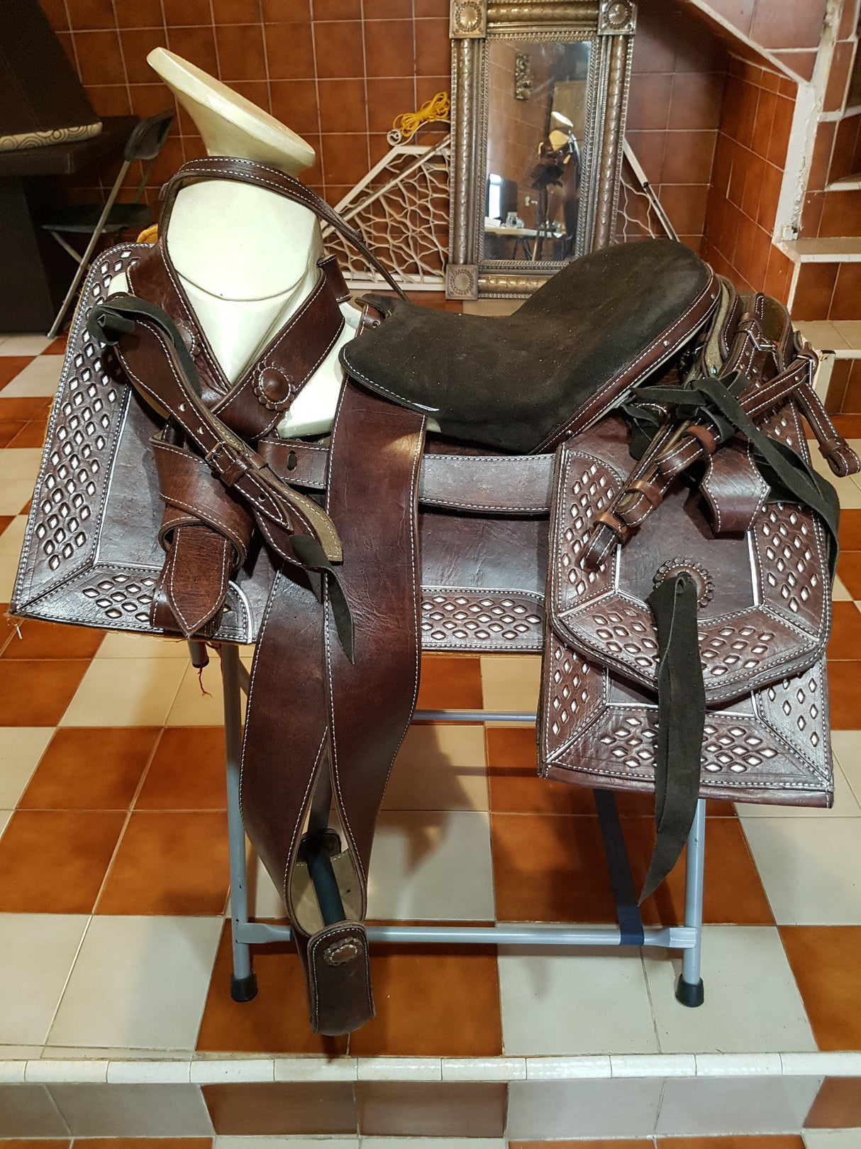Hecha en vaqueta de primera calidad, fuste 15 con equipo completo, cabezada, pecho pretal y correllones para espuelas.
