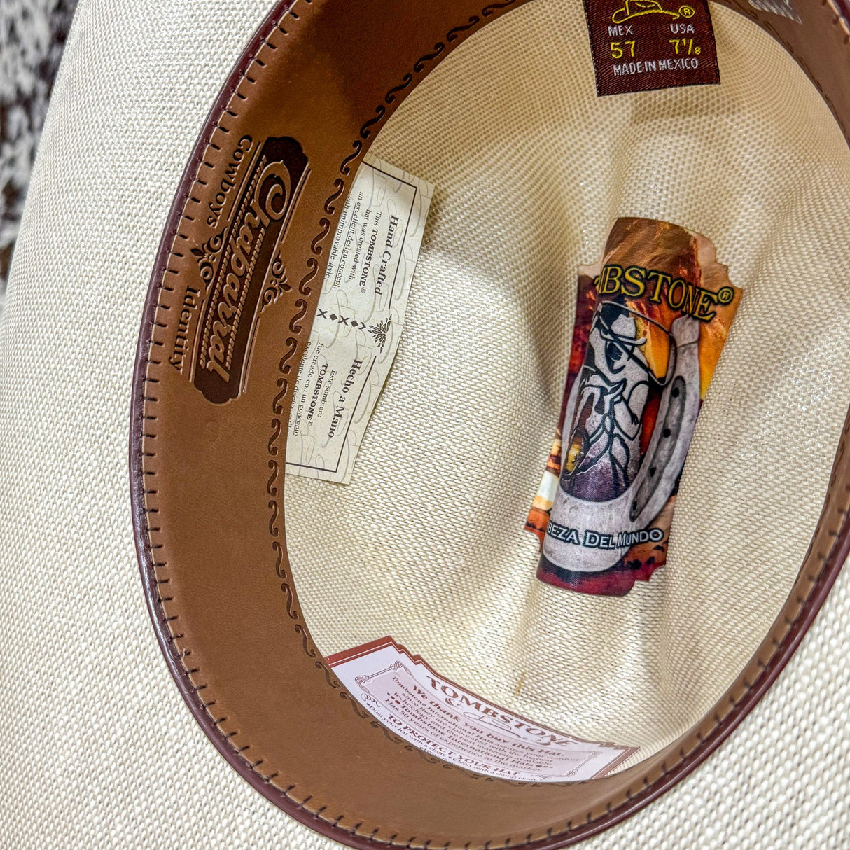 Este sombrero Tombstone modelo Chaparral es una pieza única que no puede faltar en tu colección. Con un telar fino de altísima calidad y un elegante color capuchino, te garantiza no solo estilo, sino también confort en cada momento. Su toquilla de piel café con línea blanca pintada a mano le da un toque inconfundible, mientras que su falda de 10 cm le aporta una presencia impresionante.
