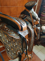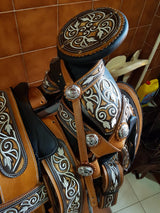 Fuste 15 ortopédico, equipada con cabezada, gargantón o pecho pretal, cincho y correllones para espuelas, todo bordado haciendo juego para la silla.