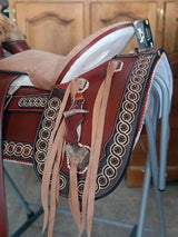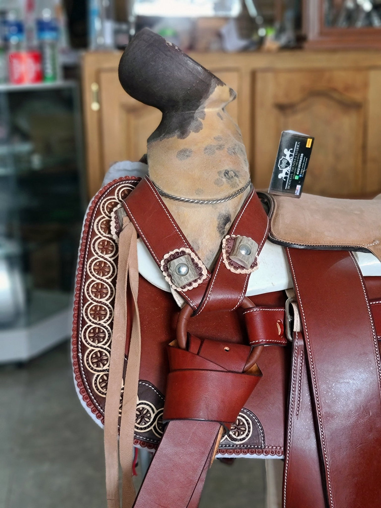 Montura charra fina de media gala navajeada pirograbada pintada a mano fabricada en sillero fino grueso y suave, cuenta con herraje de cuerno de venado.
