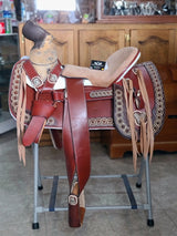 Montura charra media gala, redonda, cuerno de venado, pirograbada.